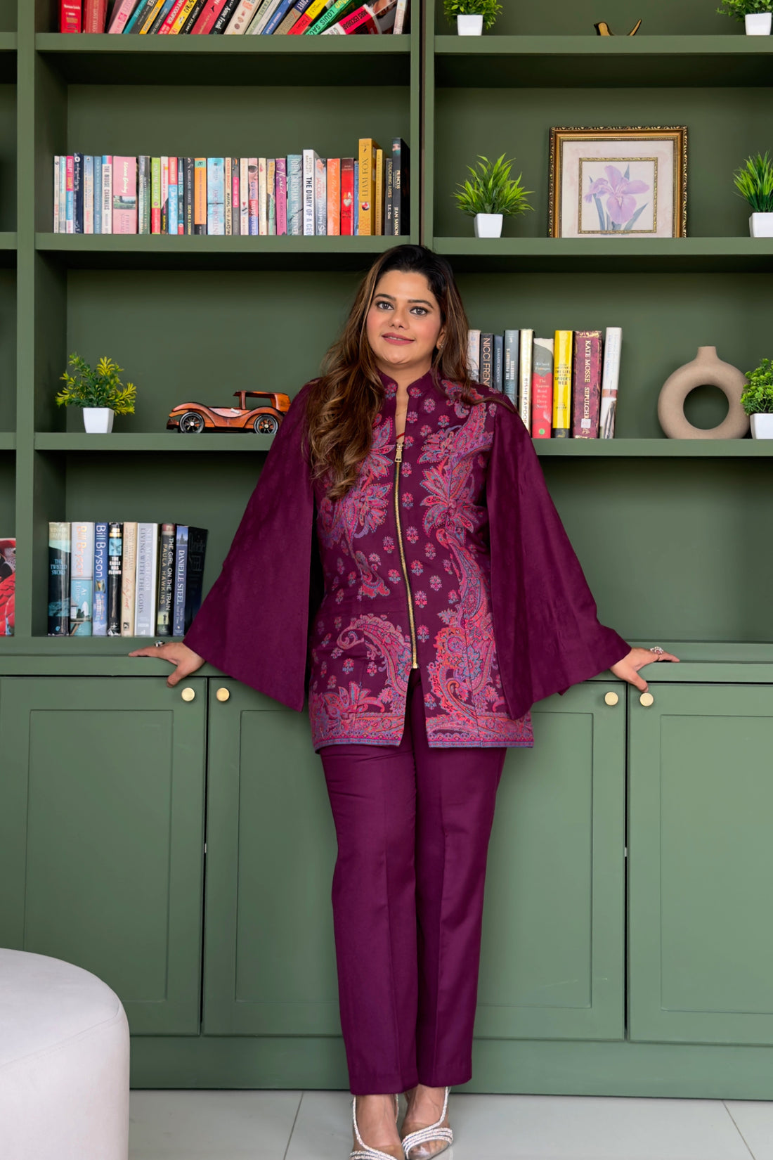 A mauve embroidered cape coat set that blends structure with fluidity. Paired with tailored trousers,...