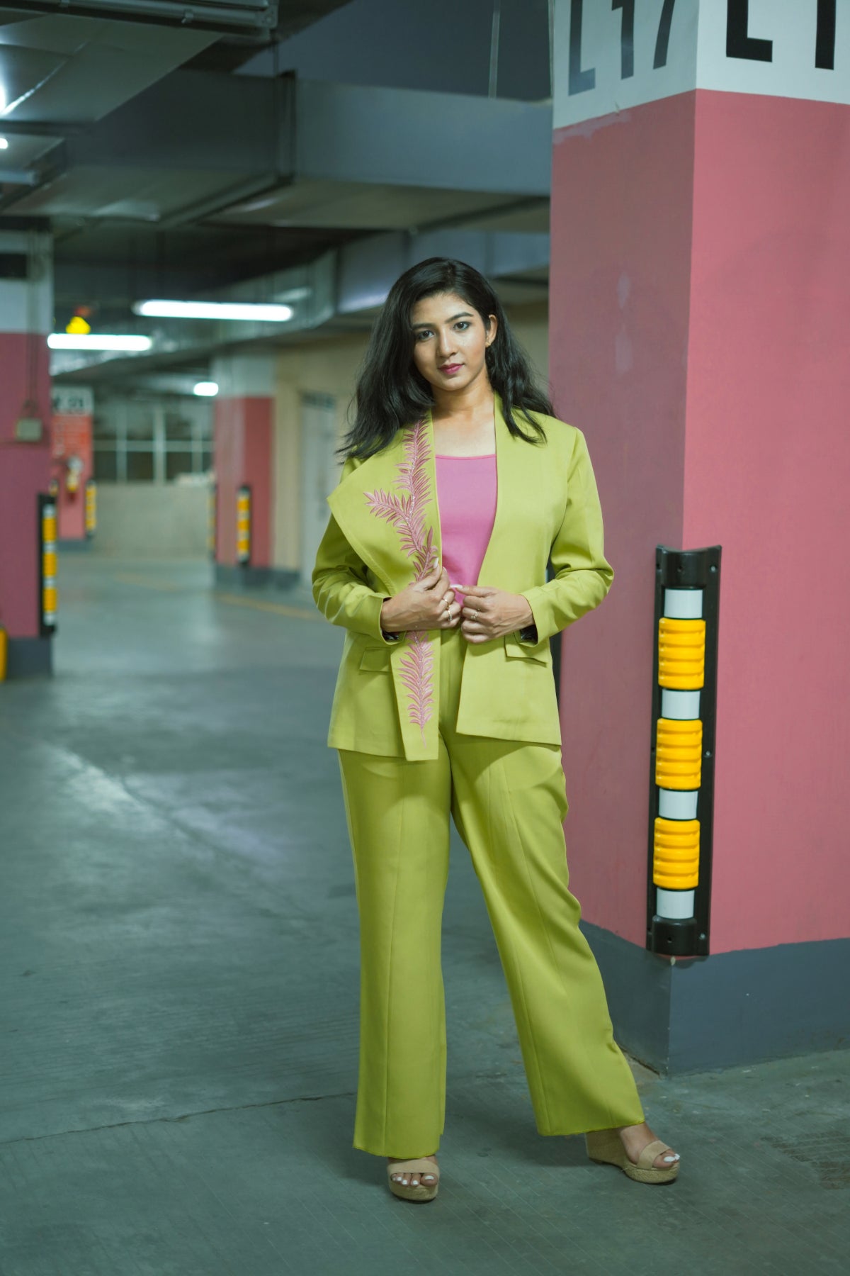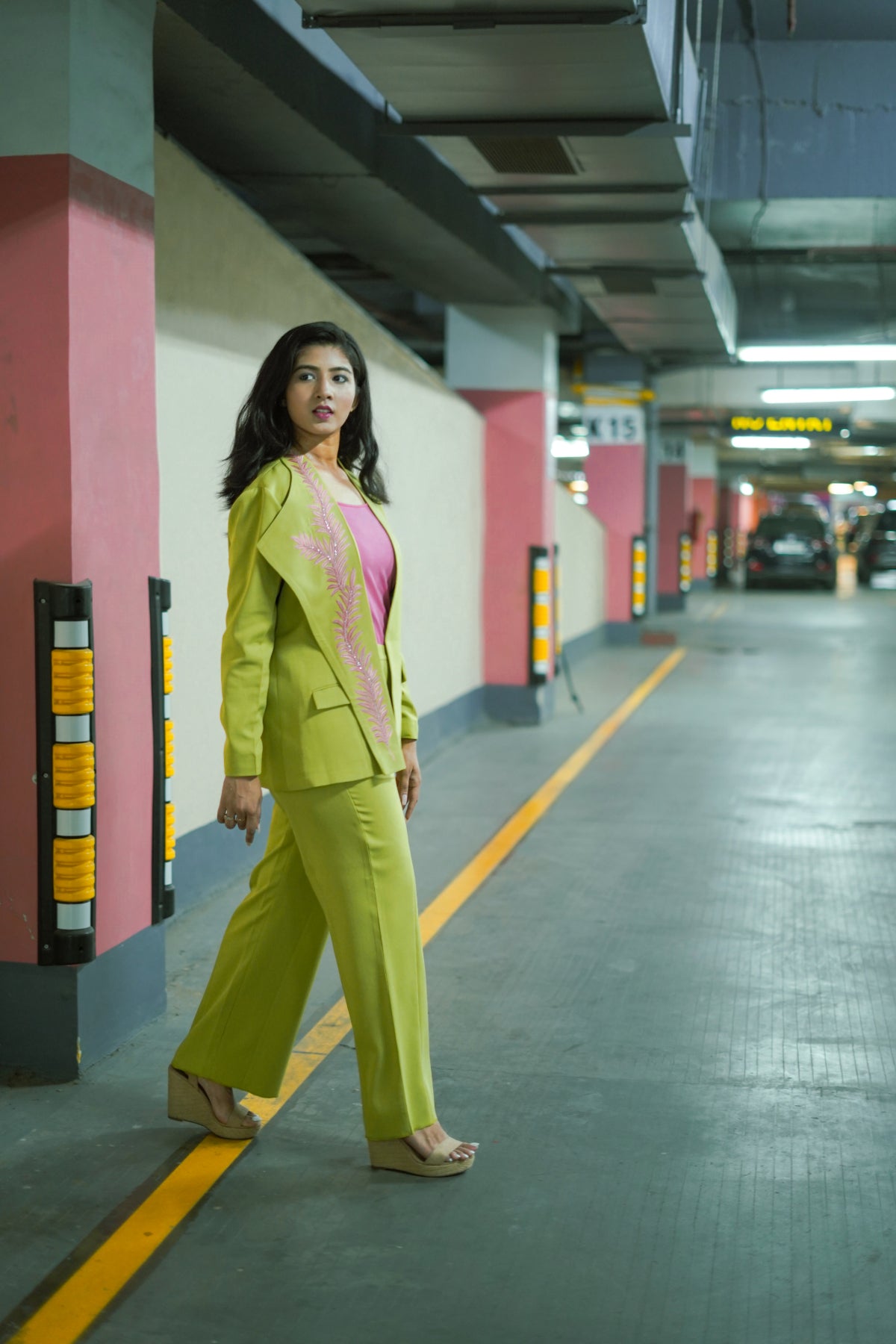 Unleash your inner style icon with the Light Emerald Pantsuit. This isn't just a suit, it's a statement. Imagine turning heads in this exquisitely tailored, muted green ensemble. The wide-leg, high-waisted pants offer a flattering silhouette, while the blazer steals the show with its oversized lapels and delicate pink floral thread embroidery. It's a modern twist on classic power dressing, blending sophistication with a touch of whimsical charm. Pair it with a blush-toned top to echo the embroidery, or dare to be different with a bold contrasting color. Whether you're commanding the boardroom or owning the night, the Light Emerald Pantsuit is your secret weapon for effortless elegance and unforgettable style.
