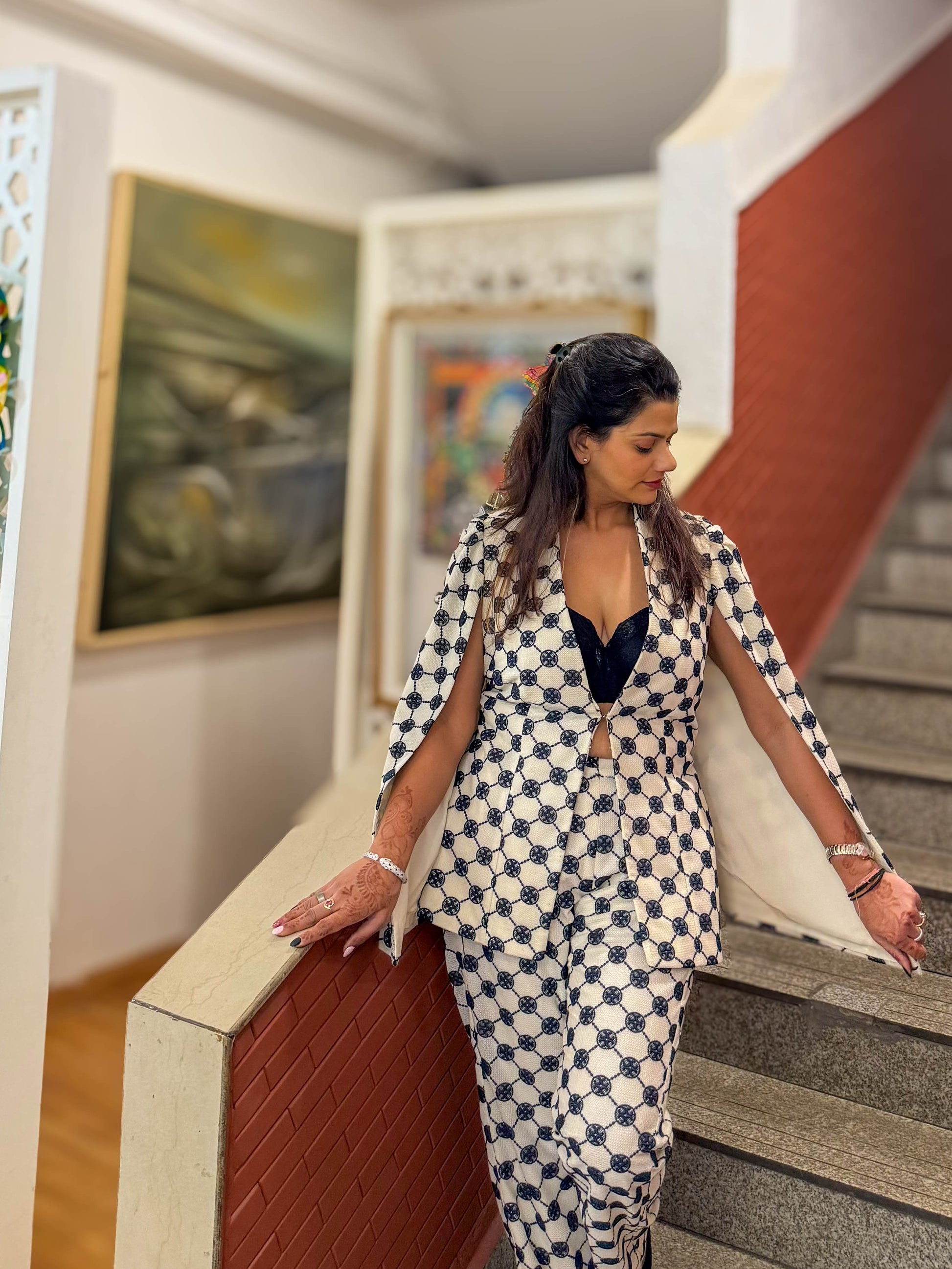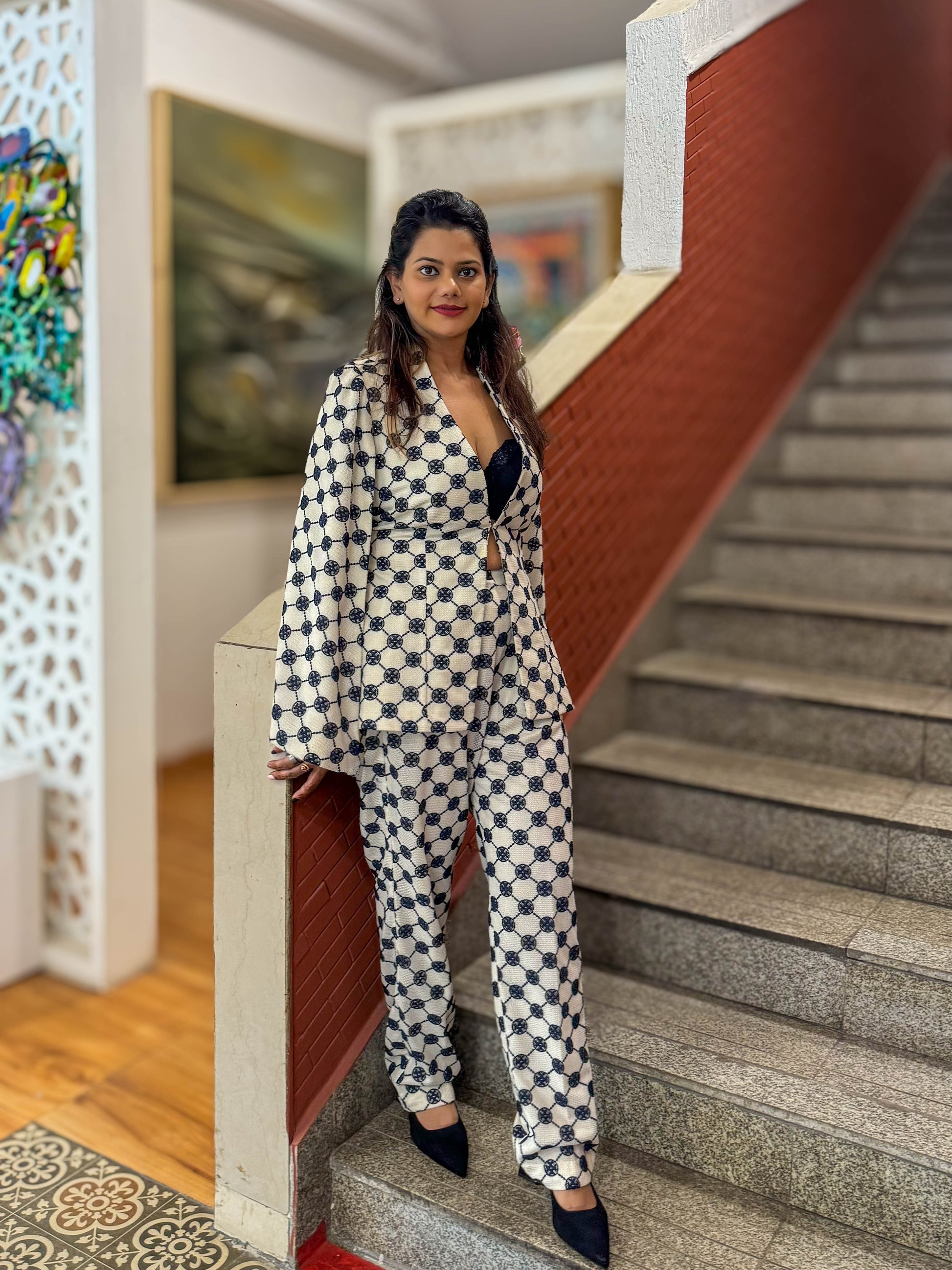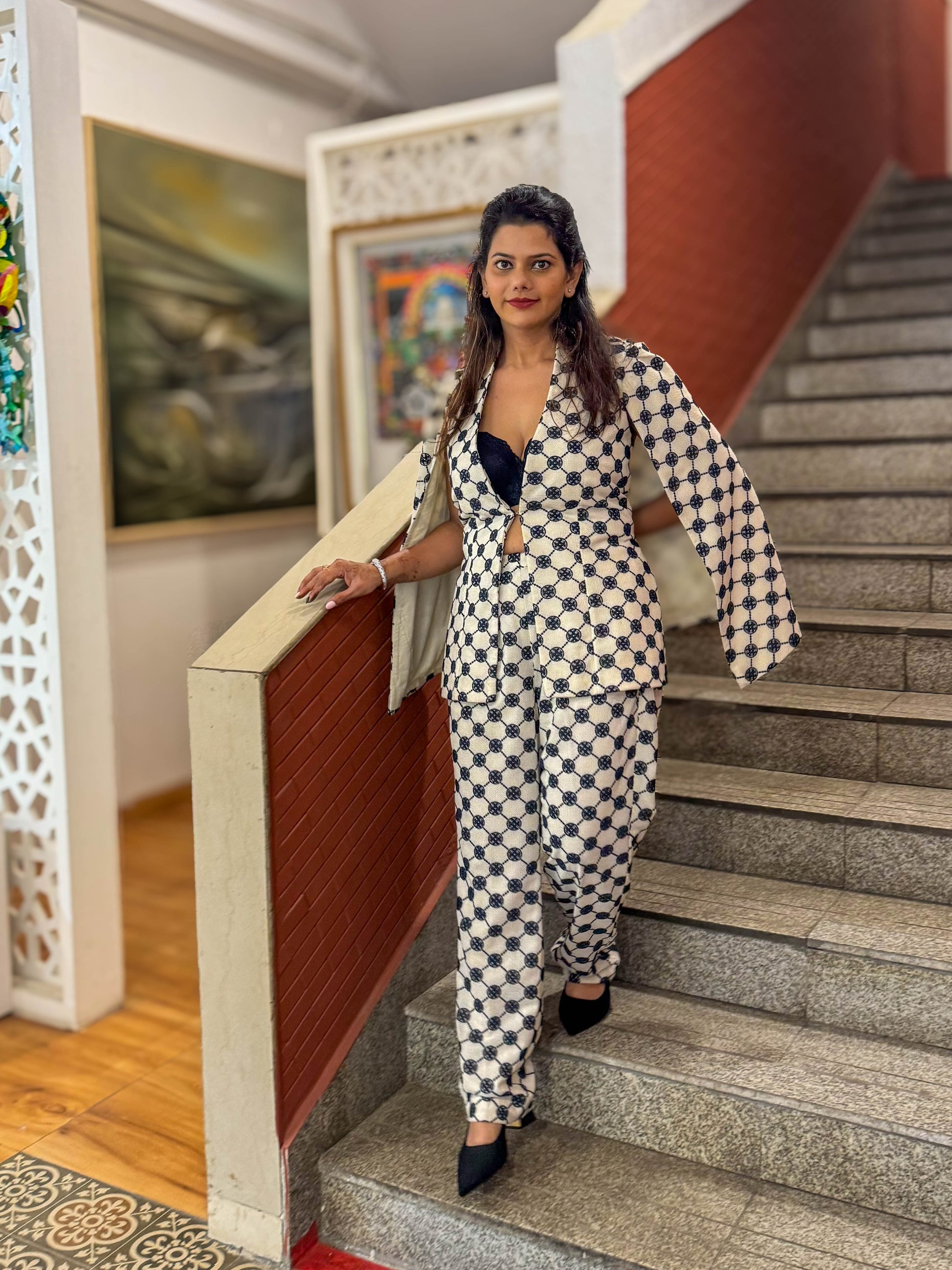 A black and white patterned flap coat set that radiates chic, contemporary style. A structured coat in an all-over geometric floral motif, paired with relaxed straight-fit trousers in the same design. Styled with a deep neckline for a modern edge, the monochrome palette creates a bold yet timeless appeal. Effortlessly balancing sophistication and trend, this set is perfect for art soirées, cocktail evenings, or high-fashion statement looks.