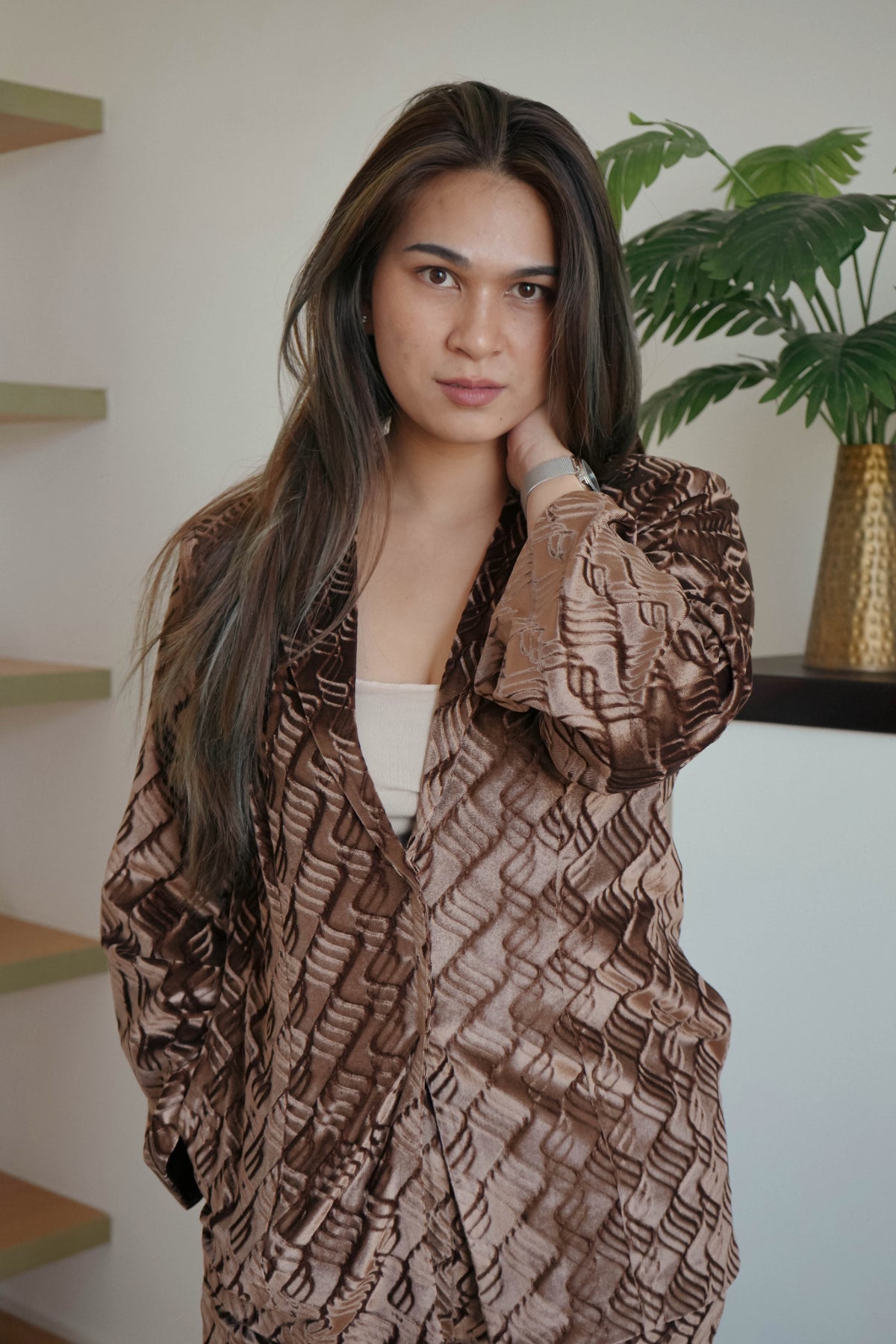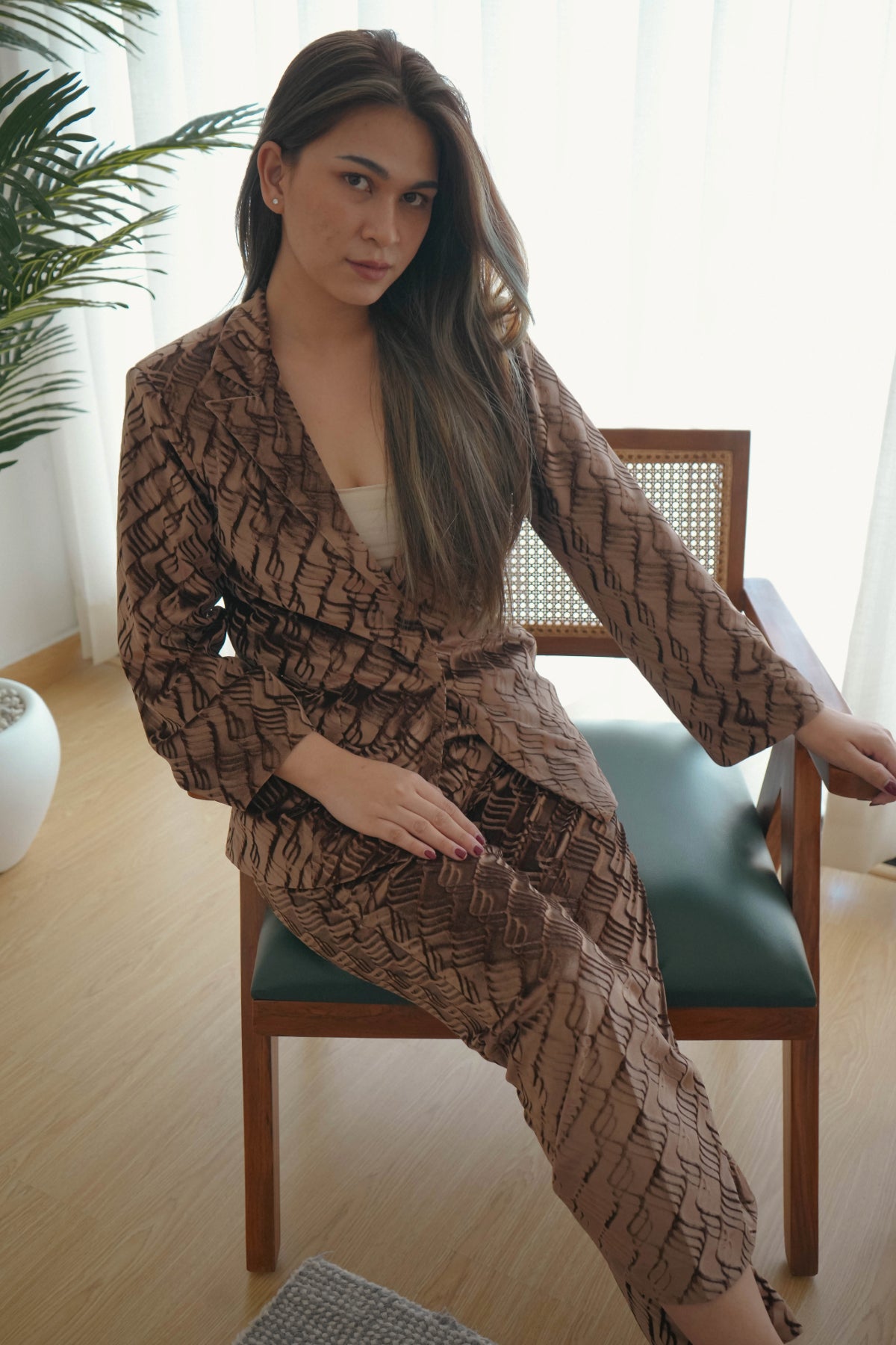 Elevate your loungewear game with our luxurious Brown Self-Velvet Coat Set — where comfort meets chic sophistication. Crafted from ultra-soft self-velvet fabric, this coordinated set features a relaxed-fit blazer-style coat and matching straight-leg trousers, both adorned with a subtle geometric pattern for a refined, textured finish.The open-front blazer drapes effortlessly over the body, offering both style and ease, while the mid-rise trousers provide a flattering silhouette with just the right amount of stretch. Perfect for casual outings, relaxed events, or elevated at-home wear, this set brings a touch of modern elegance to everyday dressing.