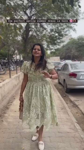 A light pastel green piece, made with intricate crochet lace fabric that has a delicate, floral eyelet pattern throughout. It has a very feminine and romantic feel, ideal for spring or summer events. The floral sheer pattern is giving the dress a soft and airy look.
