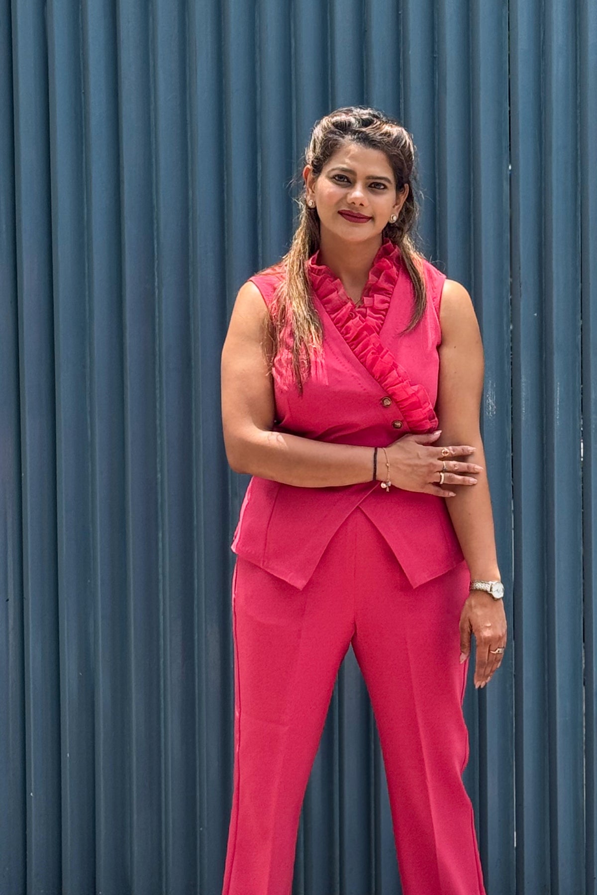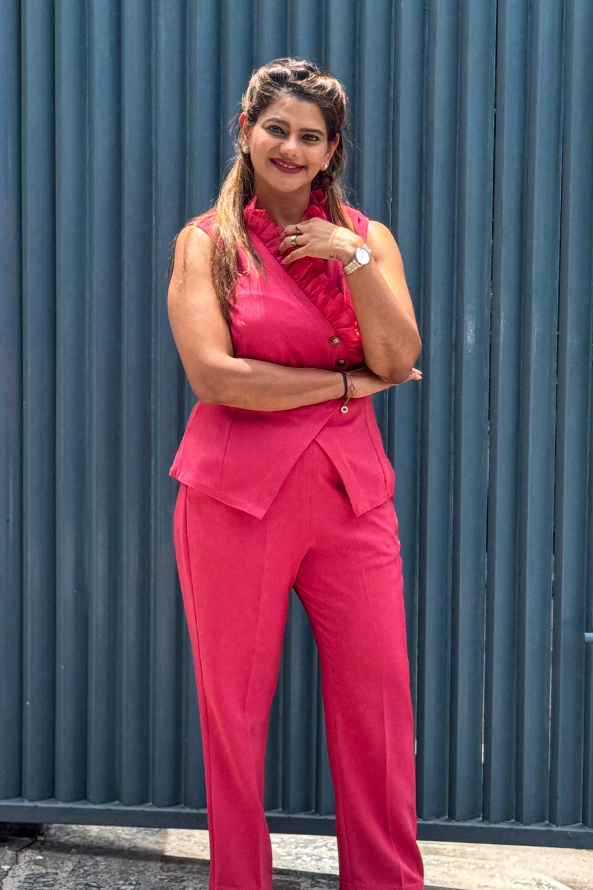 Make a statement with this vibrant pink power suit set, designed for the confident and stylish woman. This ensemble is perfect for leaving a lasting impression, whether at work, events, or social gatherings. Sleeveless blazer-style top with a structured silhouette, featuring a sharp lapel collar and side button detailing for a modern and elegant touch. High-waisted, straight-fit trousers that provide both comfort and sophistication, ensuring a sleek and tailored appearance. Premium, breathable material that offers a polished finish while being comfortable for all-day wear. Pair it with heels or block sandals for a chic professional look, or layer on bold accessories for a stylish evening outfit. Ideal for office meetings, networking events, or cocktail parties.