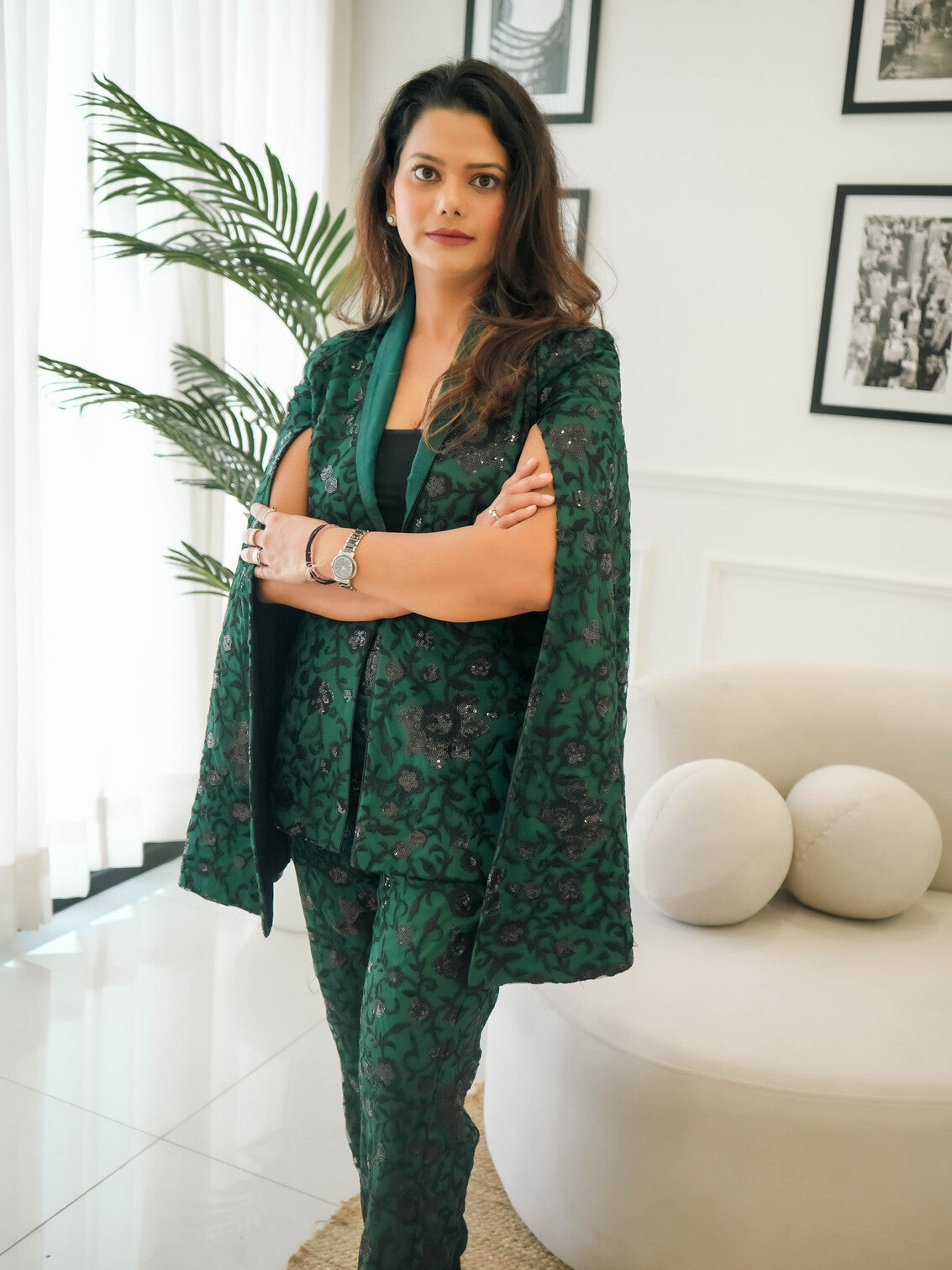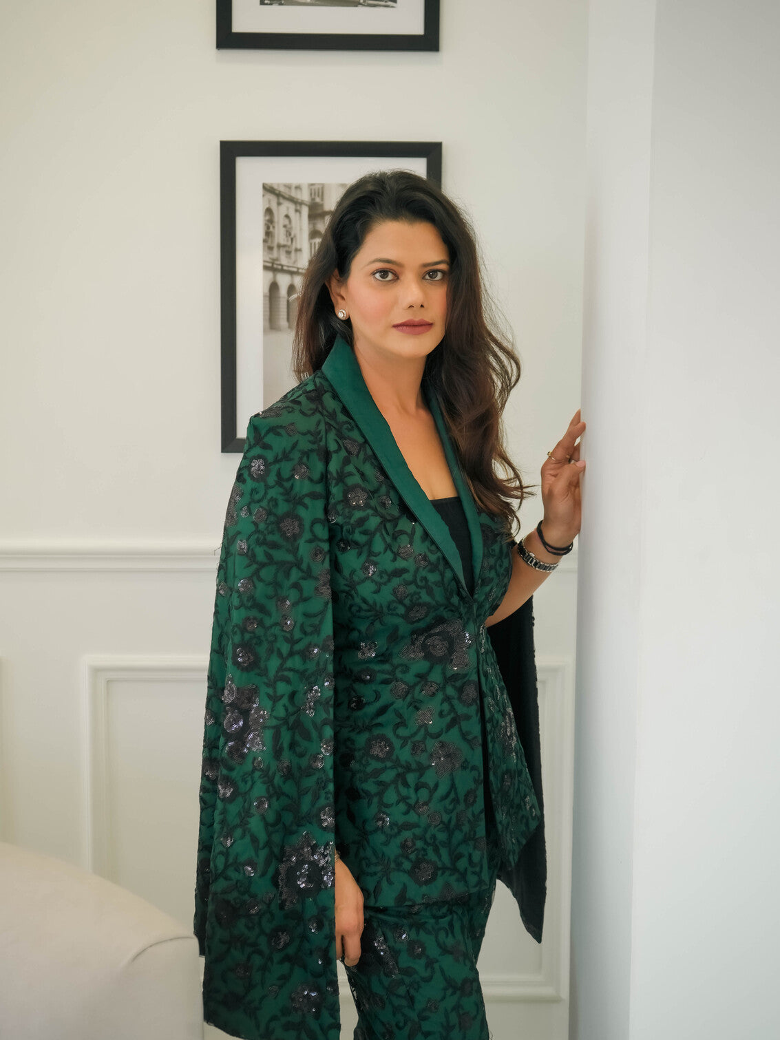 An emerald green embroidered cape coat set that exudes sophistication and modern charm. Features a structured sleeveless coat with a dramatic cape overlay, creating a striking silhouette. Intricate black floral embroidery with sequin highlights adds depth and subtle sparkle to the rich green fabric. Paired with tailored straight-fit trousers in matching embroidery, this set blends contemporary tailoring with artistic detailing. Perfect for evening soirées, formal gatherings, or festive celebrations, this outfit makes a bold yet elegant statement.
