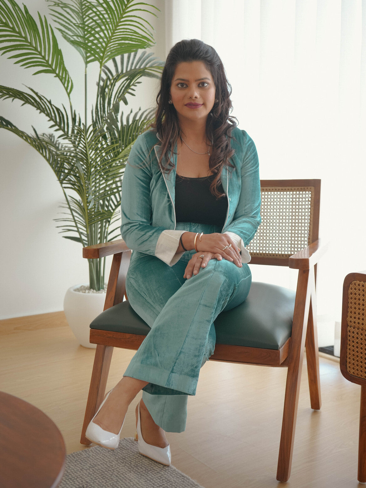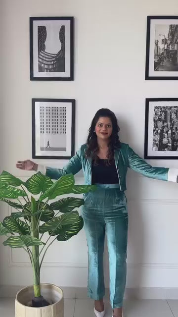 A firozi velvet cropped coat set that radiates chic elegance with a modern twist. A cropped velvet jacket in a refreshing firozi (turquoise-blue) hue, paired with matching high-waisted straight-fit trousers. The plush velvet fabric adds a luxurious sheen, while the tailored silhouette ensures a sleek, contemporary appeal. A perfect Set for evening soirées, upscale gatherings, or bold power-dressing with a touch of glamour.
