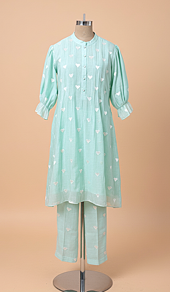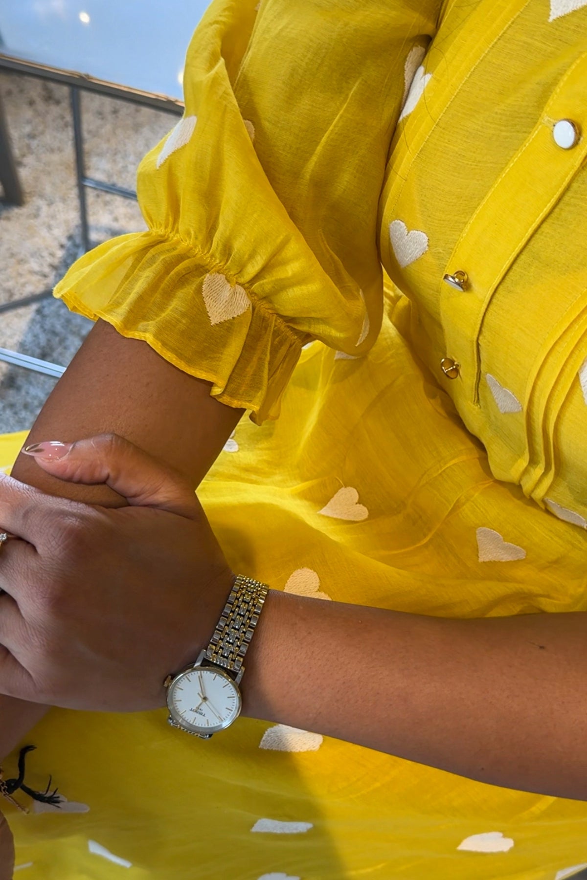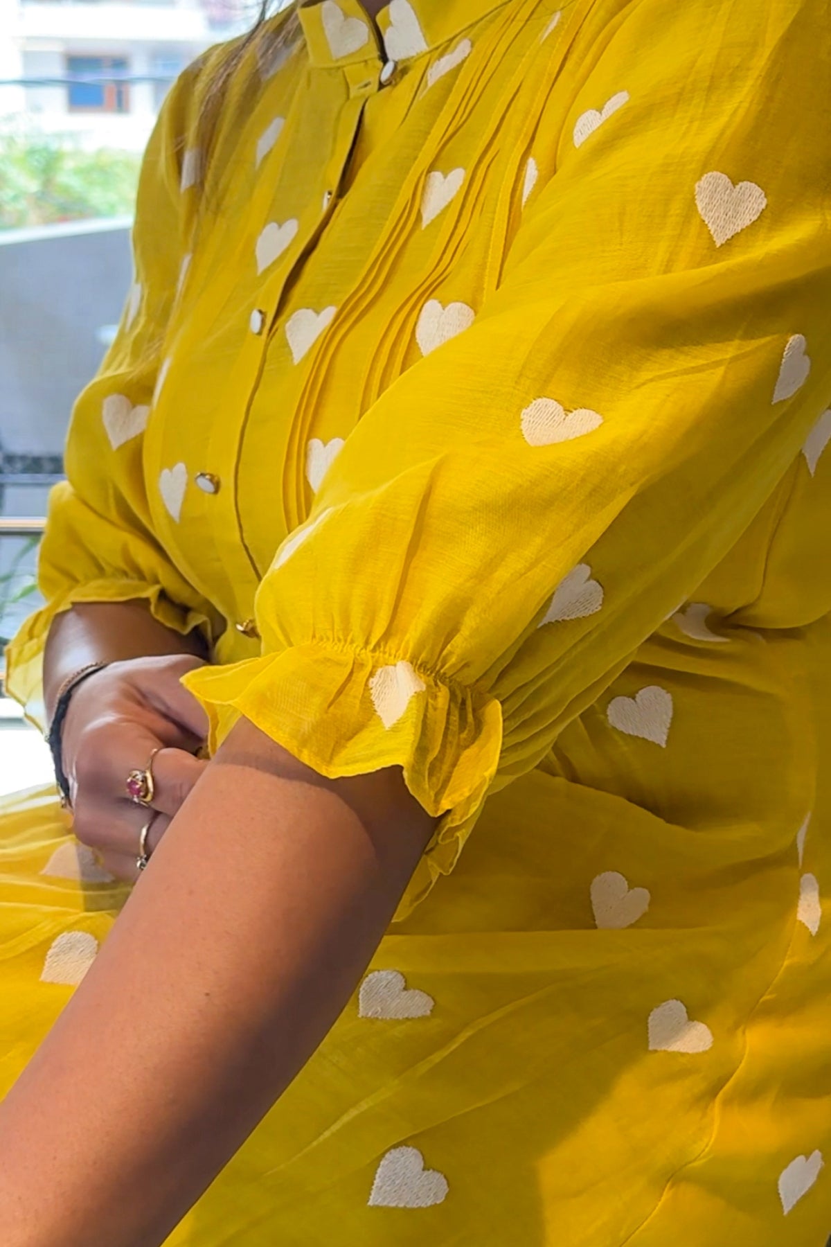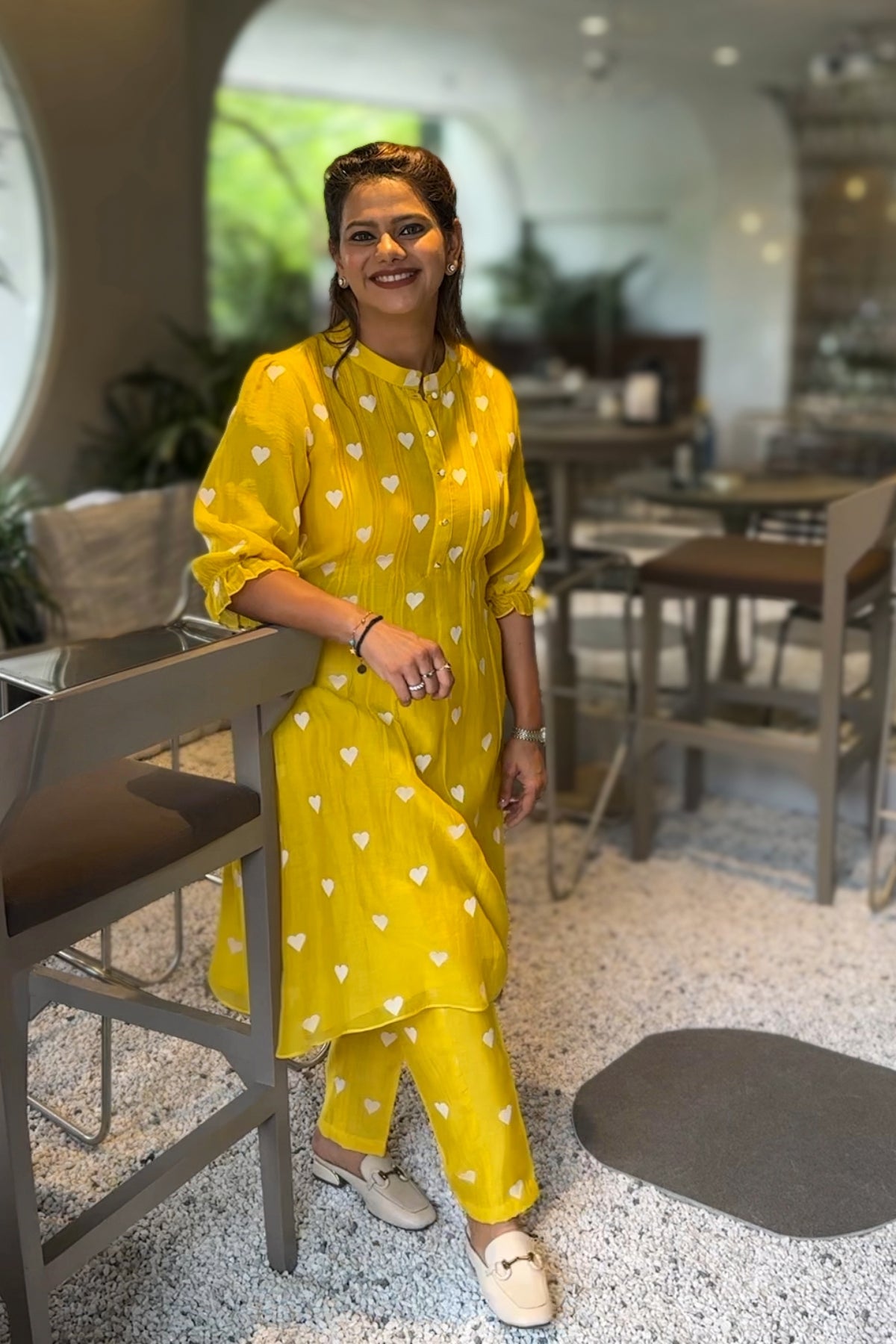 Brighten up your wardrobe with this cheerful yellow coord set adorned with charming white heart prints. Made from a lightweight, breathable fabric, this outfit is perfect for casual outings, festive gatherings, or a relaxed day at work. A-line silhouette top with a round neckline and button details, paired with matching straight-fit trousers, both featuring playful heart patterns. Ideal for semi-formal events, brunches, or everyday wear.