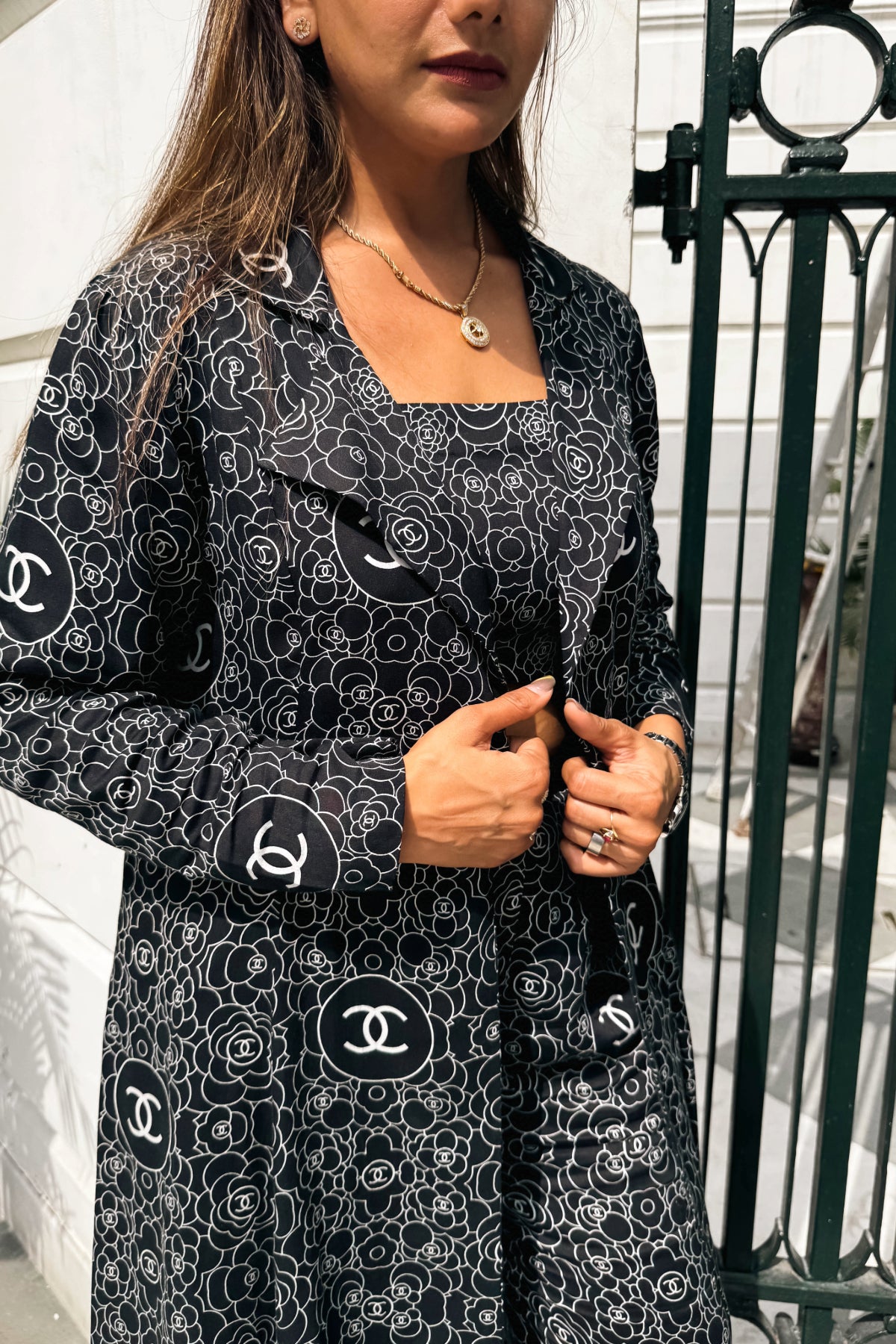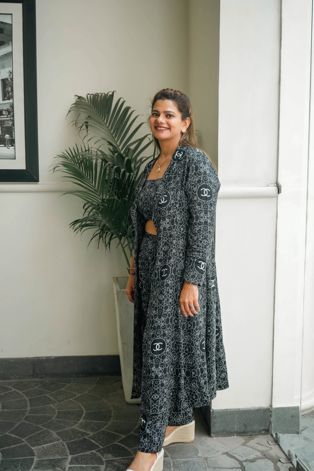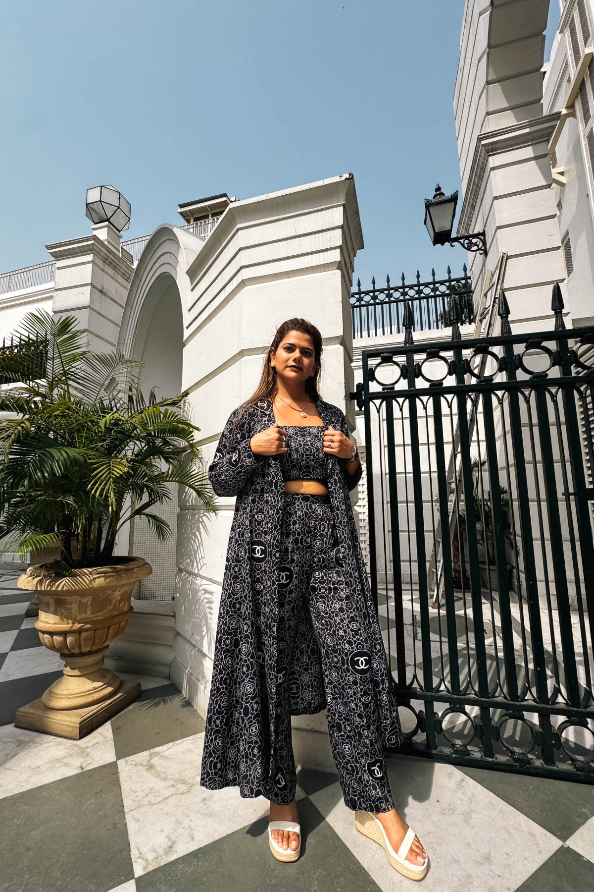 Unleash your inner icon in the Floral Fantasy Set. This three-piece ensemble reimagines classic elegance with a modern edge. The signature black and white floral print, elevates this set to a statement of undeniable luxury. The long, flowing cardigan drapes effortlessly, adding a touch of drama and versatility. Pair it with the subtly daring crop top that hints at playful confidence. The perfectly tailored, tapered pants complete the look, creating a streamlined silhouette that's both comfortable and chic.