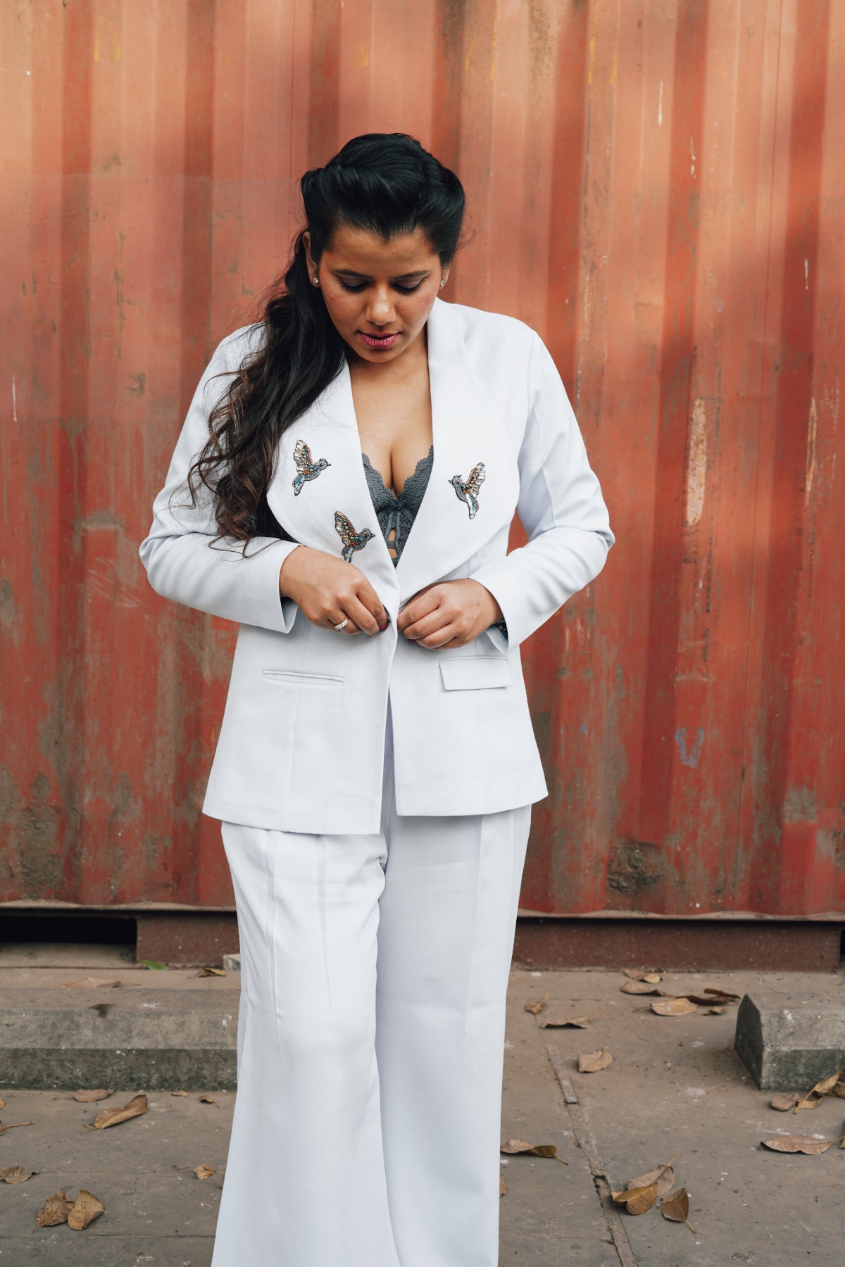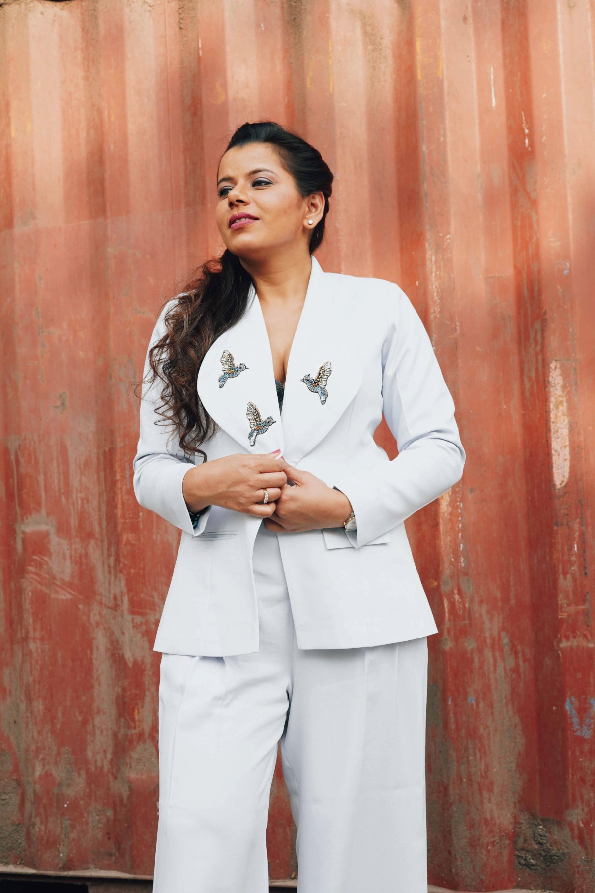 Float through your day in the Dream Suit, a modern masterpiece designed to empower and enchant. This isn't just a suit; it's a statement. The whisper-soft light blue hue evokes tranquility and confidence, while the tailored, single-breasted blazer with its delicate bird embellishments adds a touch of whimsical charm. Pairing perfectly are the high-waisted, wide-leg palazzo pants that flow with effortless grace. Imagine the feeling of freedom and sophistication as you move, commanding attention without sacrificing comfort. Whether you're conquering the boardroom or captivating at a cocktail party, the set is your go-to for unparalleled style and unforgettable presence. Embrace the unexpected.