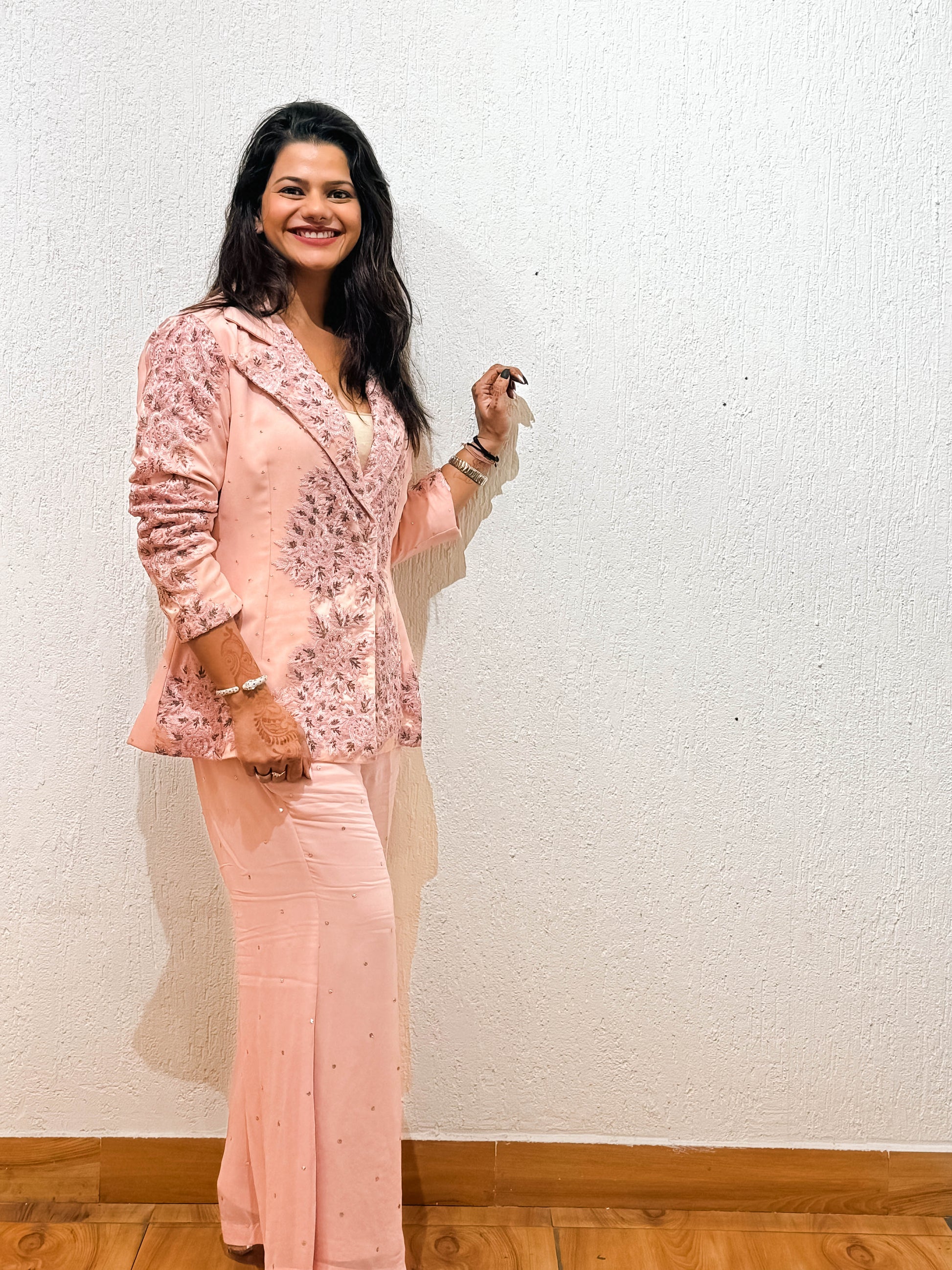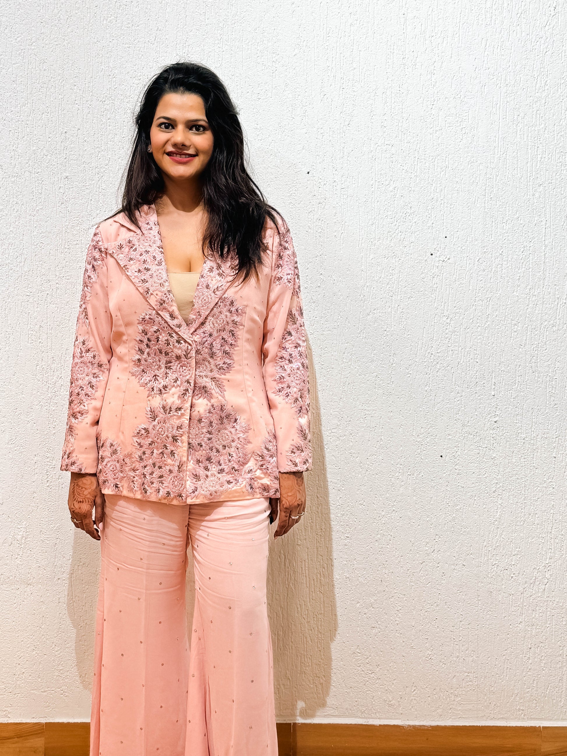 A pink embroidered coat set, designed with a perfect balance of elegance and comfort. A longline coat crafted in a rich fabric, beautifully adorned with delicate floral embroidery and subtle sequin work, adding a refined shimmer. It is paired with matching wide-leg trousers embellished with small, scattered sequin work, giving the ensemble a graceful flow. The structured silhouette of the coat, combined with the fluidity of the pants, makes this set ideal for festive occasions, cocktail evenings, or contemporary ethnic gatherings.