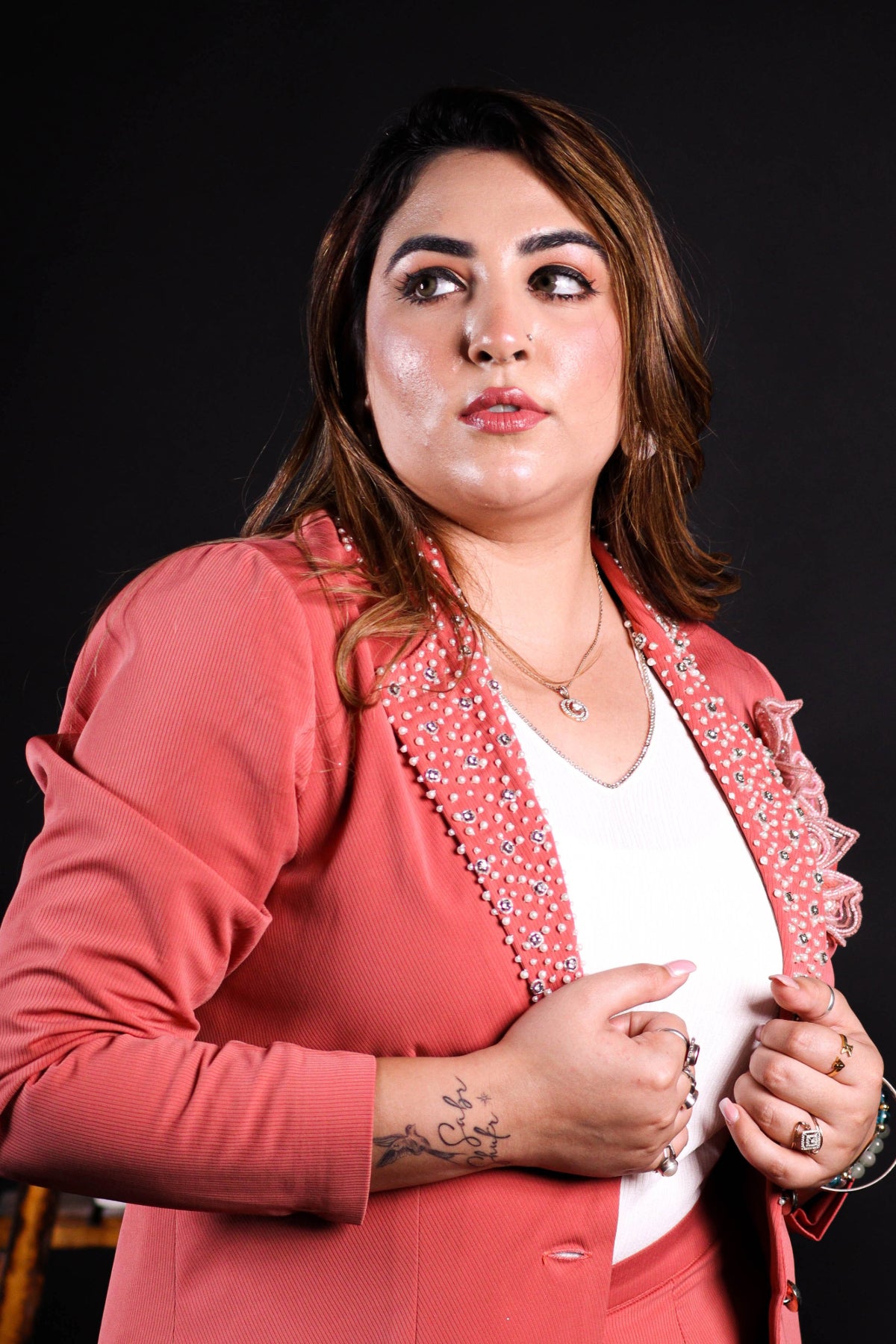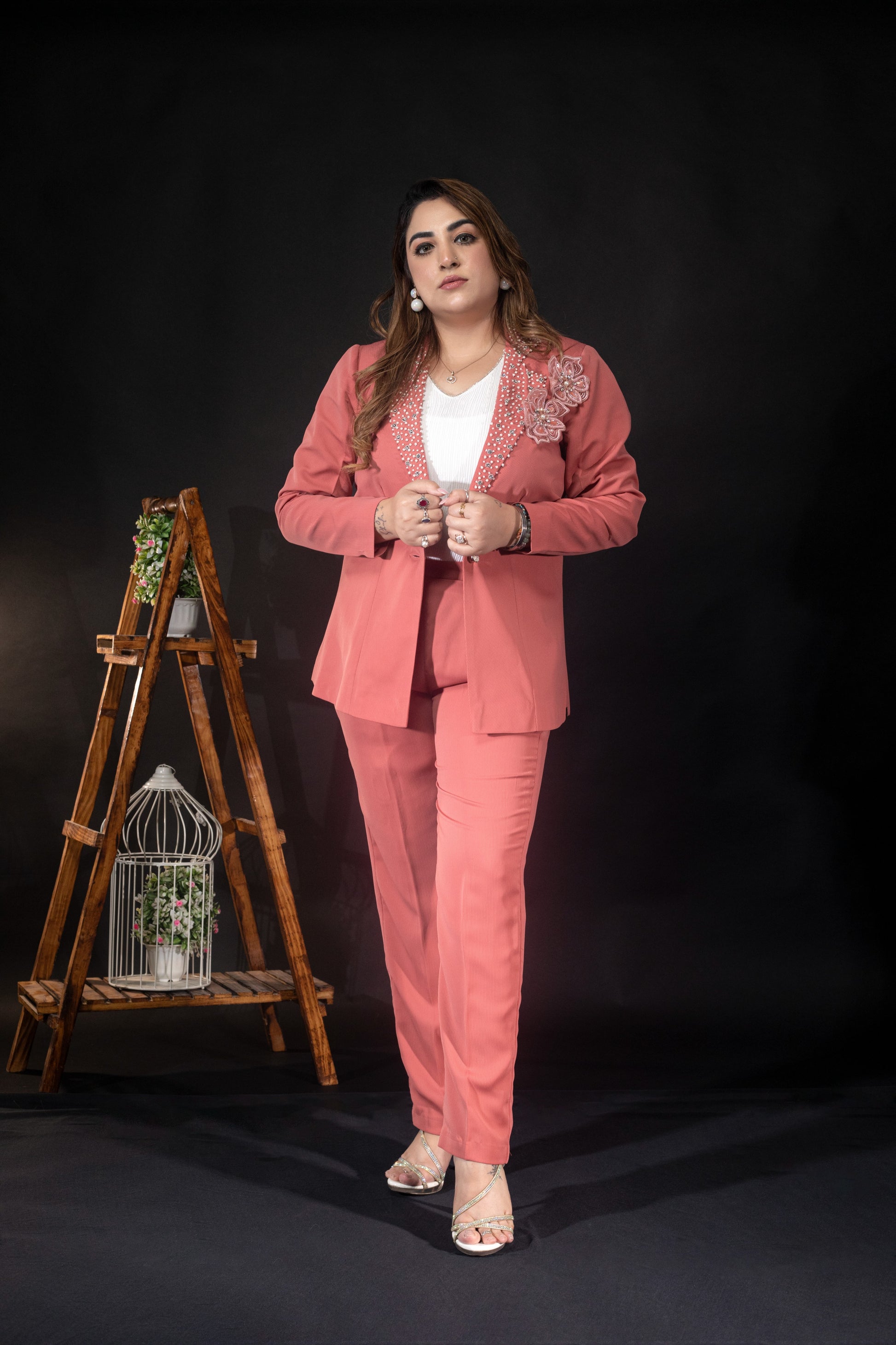 Step into the spotlight with this vibrant Coral Imported Georgette Suit Set. Crafted from luxuriously soft georgette, this set is a statement piece that exudes confidence and playful sophistication. The jacket features a unique, embellished collar adorned with delicate white accents, adding a touch of timeless elegance. The subtly puffed sleeves create a flattering silhouette. Paired with matching coral pants, this suit is perfect for making a lasting impression. Whether you're commanding the boardroom or turning heads at a social event, this suit is your go-to for unforgettable style.