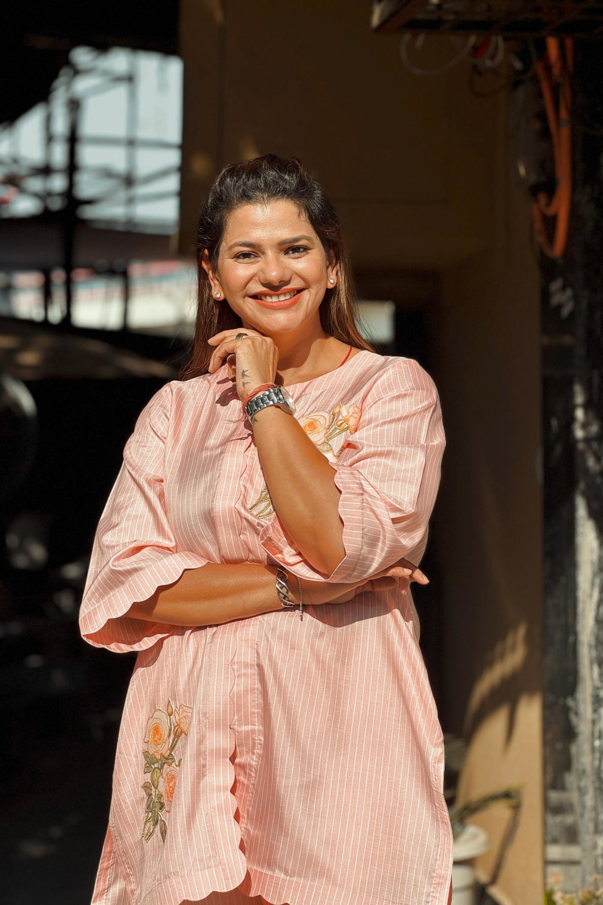 This two-piece outfit appears contemporary take on traditional Asian attire, a kurta and salwar/pant style. The entire outfit is a seemingly in a crisp silk satin fabric with very subtle, fine vertical stripes woven into it. It has a collarless V-neckline and a scalping placket that runs down the center. The sleeves are three-quarter length and have a wide, bell-like flared cuff. The most distinctive feature is the appliquéd floral design in a vibrant, contrasting colors. The style of the flowers is bold and abstract. The lower is a pair of same color of top with a baggy style, farshi salwar or a straight pant. The fabric matches the tunic.