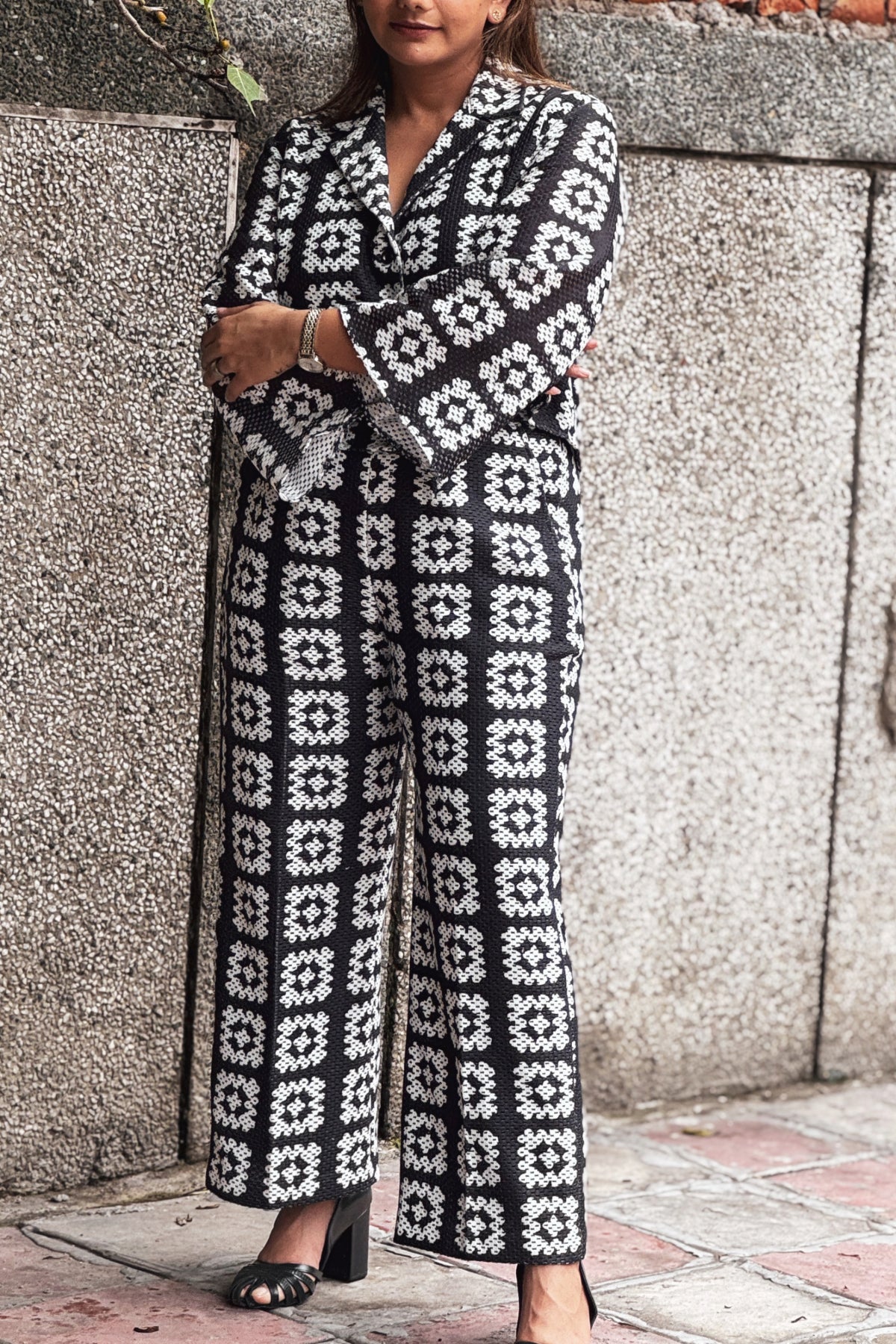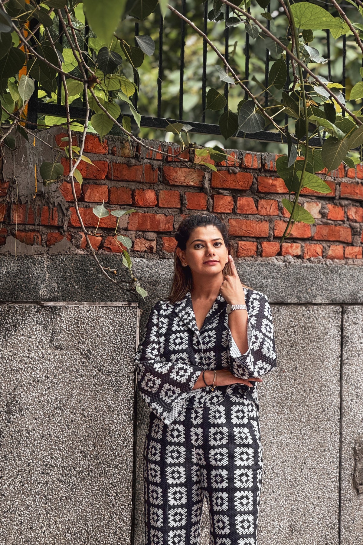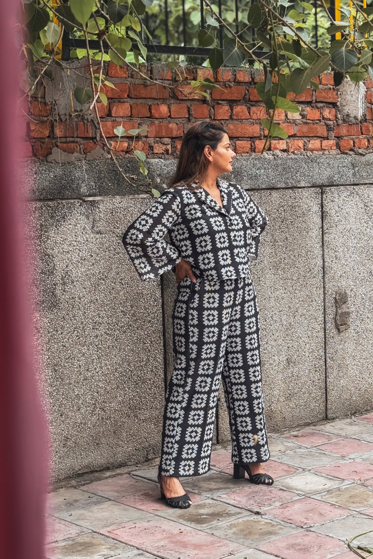 The Geometric Dreams Set isn't just sleepwear; it's a statement. Bold black and white squares dance across a luxuriously soft fabric, each holding a secret world of intricate design.The button-down top, with its relaxed collar and subtly flared sleeves, exudes effortless chic. Paired with wide-legged pants that flow with every move, this set redefines bedtime comfort.