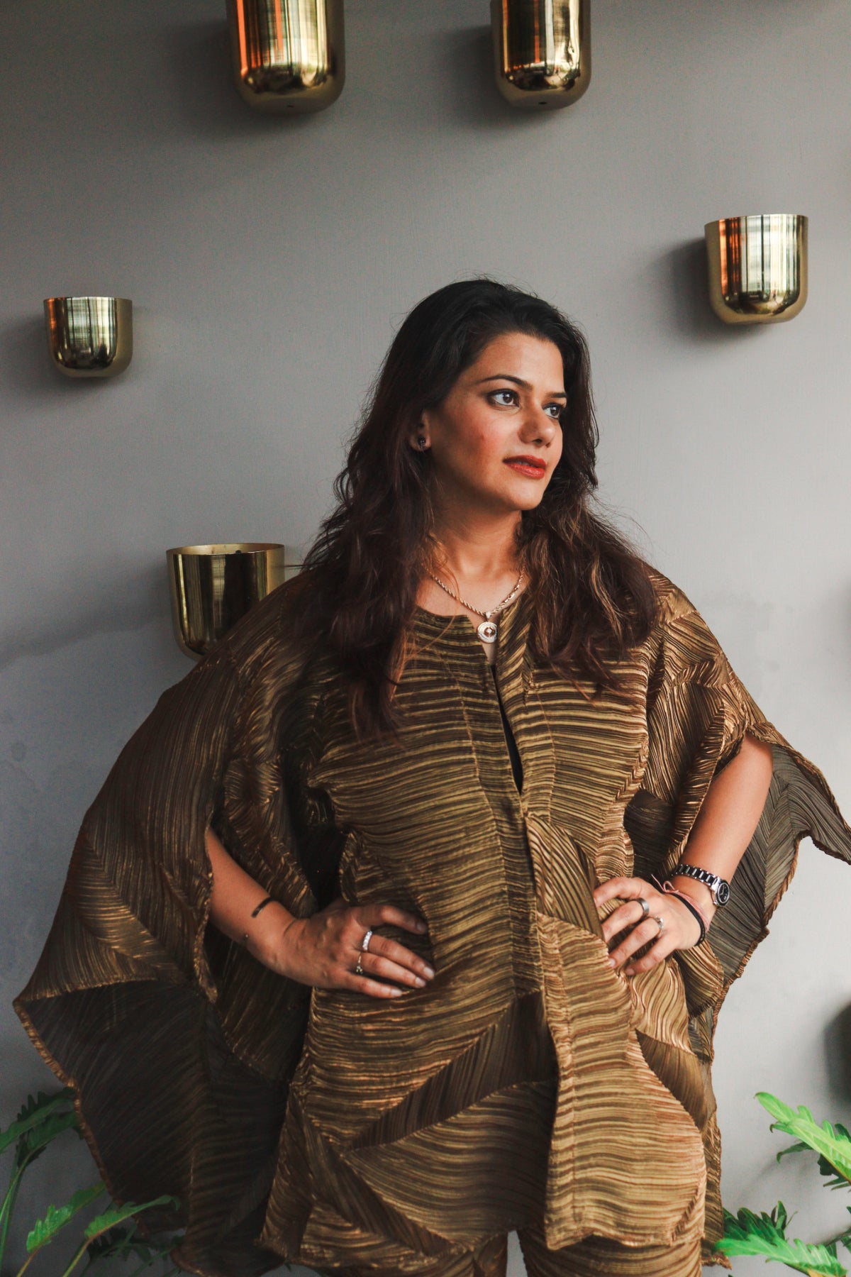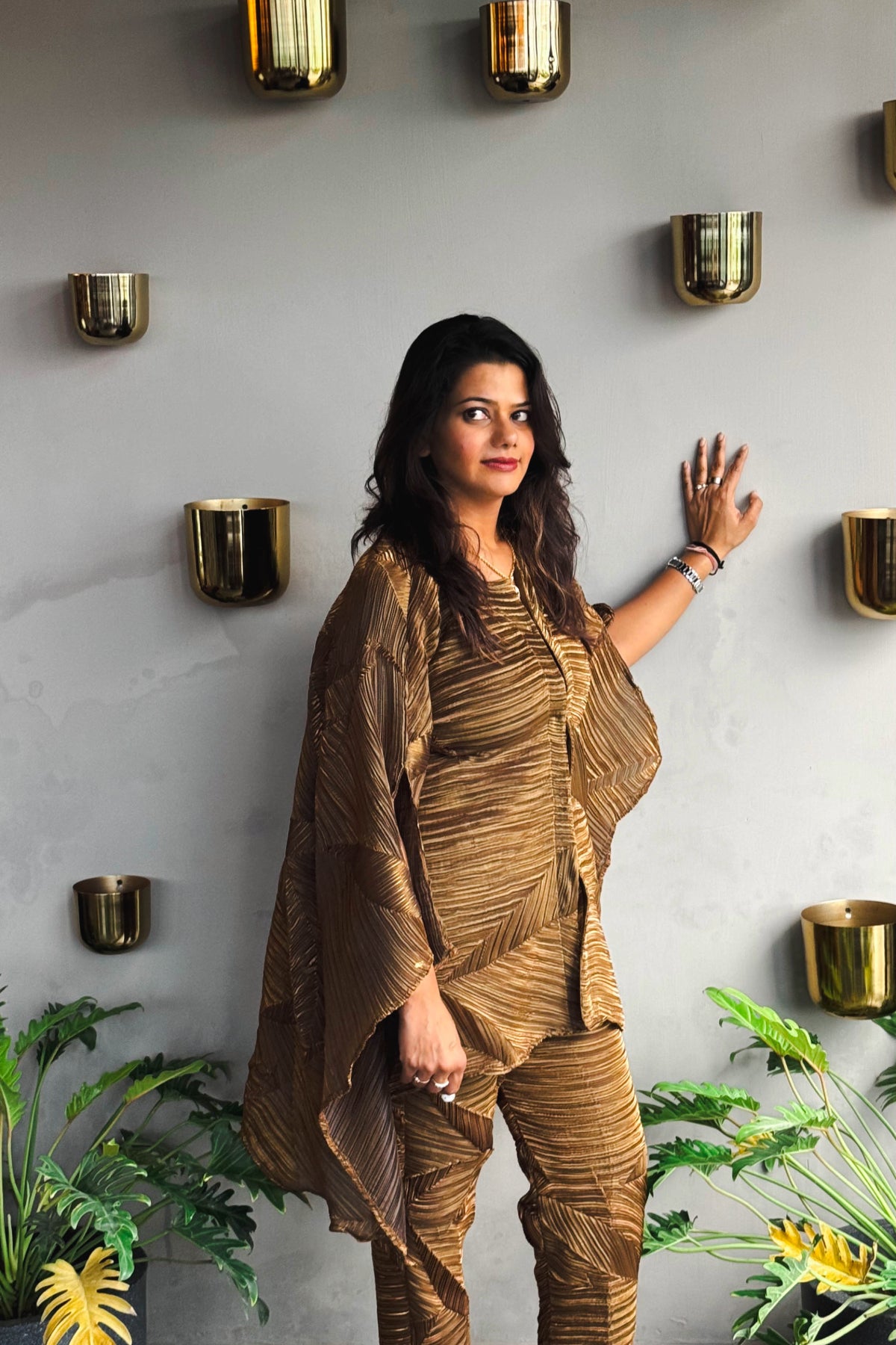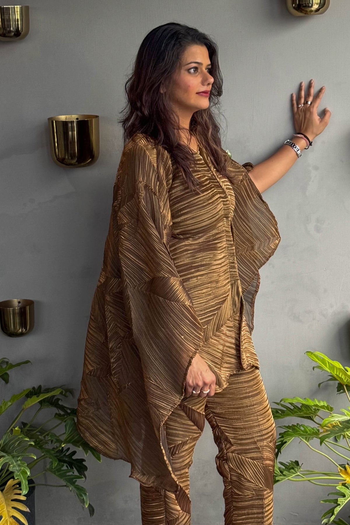 Bathe in the afterglow with the Golden Hour Set. This isn't just an outfit; it's a mood. Imagine yourself draped in liquid sunshine, the shimmering bronze-gold fabric catching the light with every move. The unique, textured design adds depth and intrigue, creating a captivating visual tapestry.The cape-style top flows with an effortless grace, revealing glimpses of a matching layer beneath. Wide, bohemian sleeves whisper tales of faraway adventures and carefree spirits. The straight-leg pants, cropped just above the ankle, complete the look with a touch of modern sophistication.Feel the luxurious weight of the fabric as it drapes against your skin. This set exudes a vintage-inspired elegance, perfect for those who appreciate timeless style with a touch of bohemian flair. Embrace the golden hour, wherever you go.