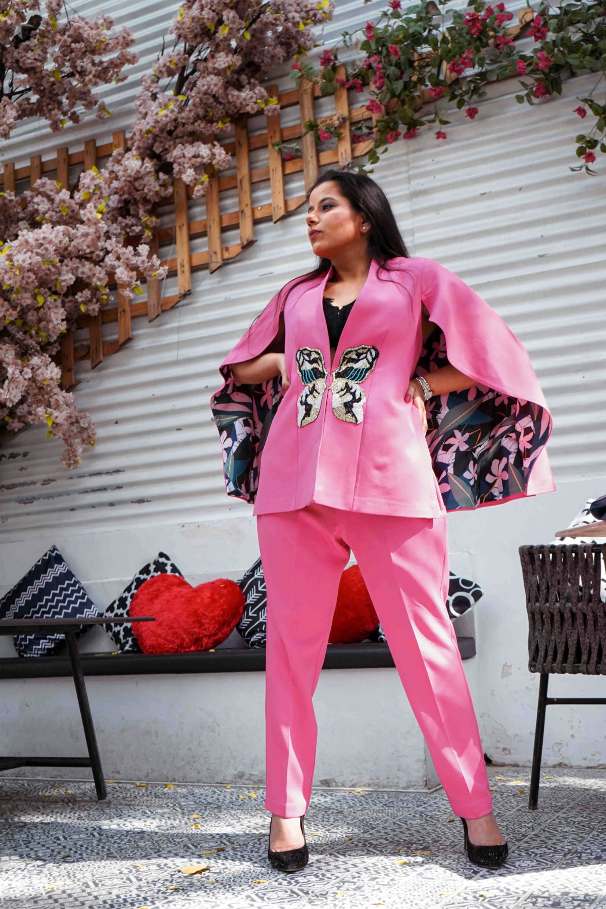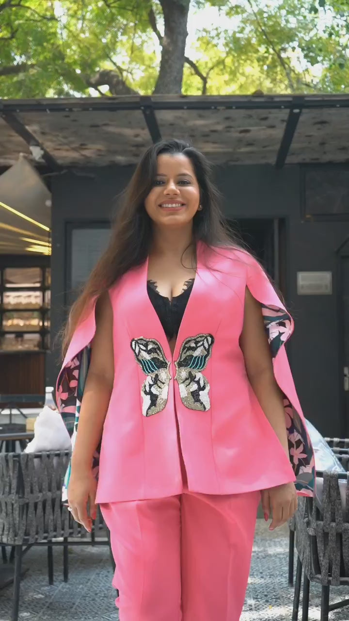 Elevate your wardrobe with this exquisite hot pink suit set that effortlessly combines elegance with playful charm. The tailored jacket features delicate butterfly embroidery that adds a whimsical touch to the sophisticated silhouette. Inside, a surprise awaits with a beautifully patterned lining that peeks through when you move. The versatile design transitions seamlessly from daytime engagements to evening affairs, ensuring you make a memorable impression wherever you go. Crafted for comfort without compromising on style, a must-have for the modern woman who appreciates refined details.